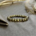 A golden pyrite bracelet is a striking accessory with a bold metallic shine that mimics gold. The natural luster and faceted texture of pyrite beads make it an eye-catching piece, perfect for both casual and formal wear. It feels solid and well-made, with a nice weight on the wrist. Beyond aesthetics, pyrite is believed to bring confidence and protection, adding a symbolic touch to its appeal. However, since pyrite is a brittle mineral, care is needed to avoid chipping or breakage. Overall, it’s a stylish and unique bracelet for those who love earthy, statement jewelry.