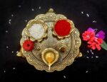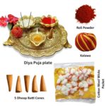 DETAILS :- Size:- Radius – 7.5″(approx), Hight:- 0.75″ Material: Aluminium with golden color electroplating. Package include pooja thali with dhoop batti, cotton batti, roli powder and kalawa.