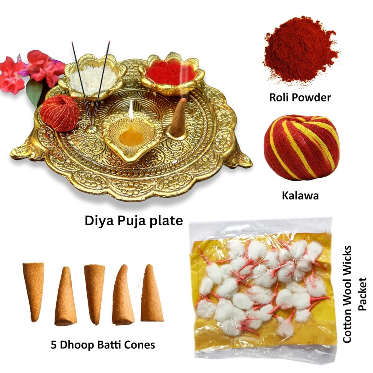 Overall, a really good set with plate, statues, vermilion, roli thread, and dhoop incense. While I expected the plate but I was happily surprised with the additional stuff to be fully puja ready.