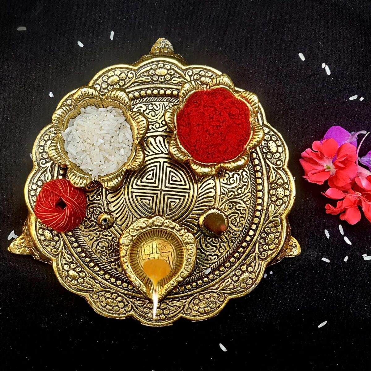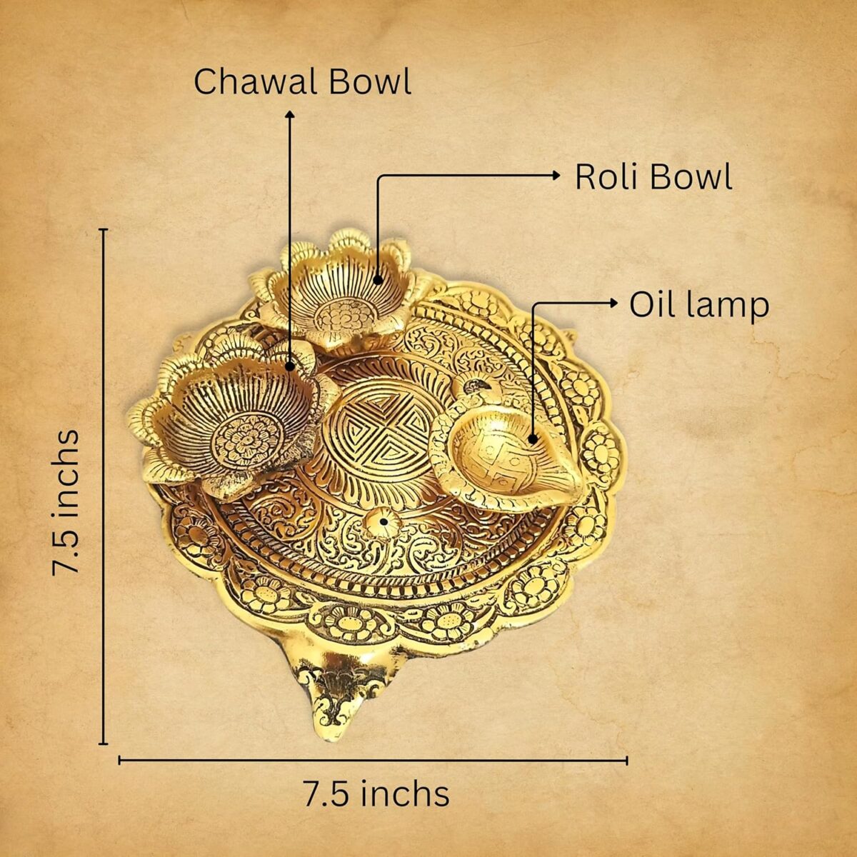 DETAILS :- Size:- Radius – 7.5″(approx), Hight:- 0.75″ Material: Aluminium with golden color electroplating. Package include pooja thali with dhoop batti, cotton batti, roli powder and kalawa.