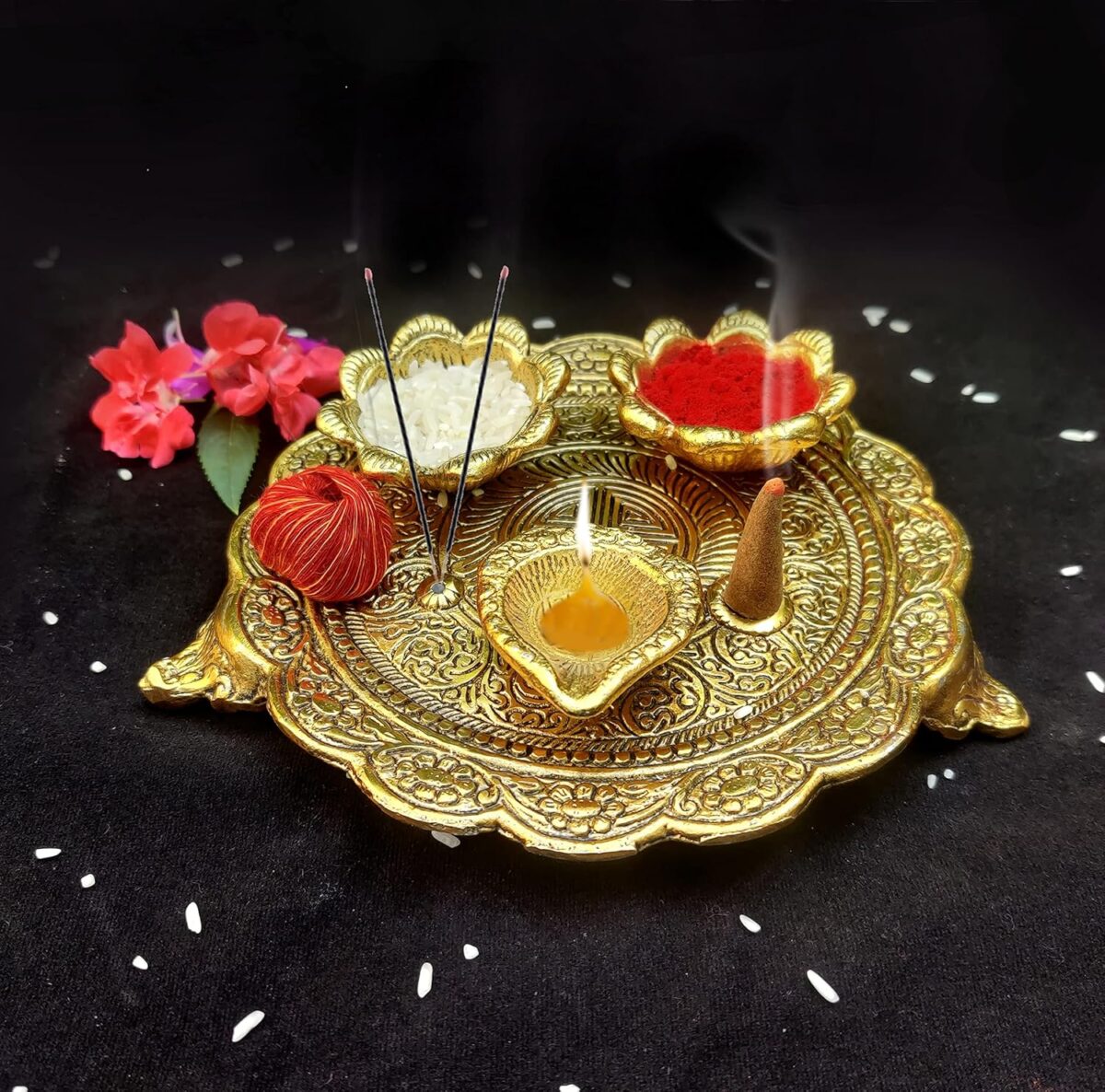 HOME DECORATION ITEM: This beautiful Indian puja plate can be used as festival and many indian rituals Pooja Mandir Interior Decoration Accessories / Table Decor Items or Showcase Decoration Welcome plate, indian return gifts, for pooja.