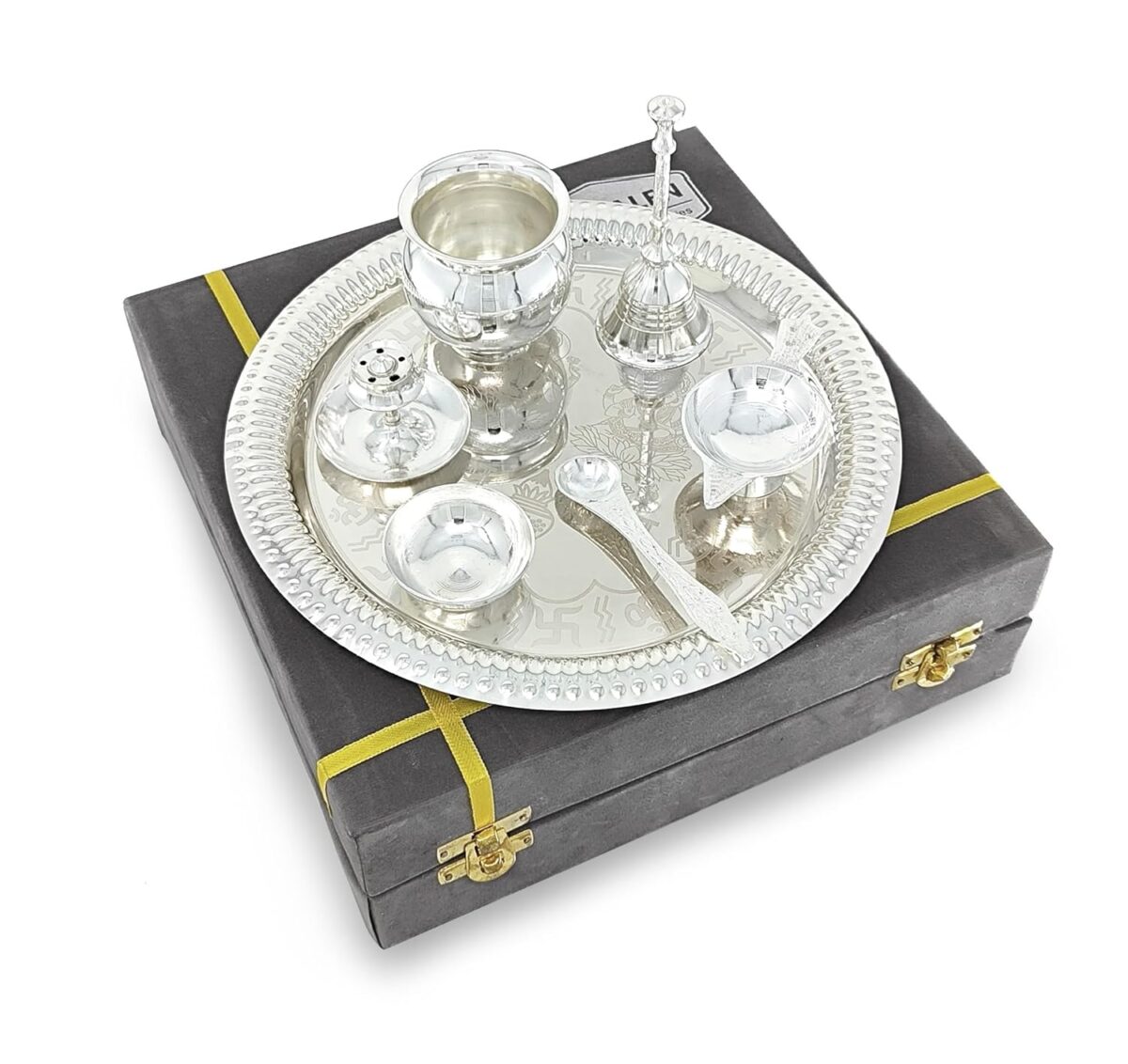 BENGALEN Pooja Thali Set Silver Plated with Grey Gift Box Designed 22 cm Puja Plate Kalash Bowl Ghanti Spoon Dhup Dan Diya for Home Office Diwali Wedding Return Gift Items