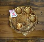 Our handcrafted Pooja Thali is a beautiful addition to your mandir and to your home. It can be used as a centerpiece, or an elegant gift to celebrate festivals like Diwali and Pongal or any other celebration in your family. Here you can very easily arrange diya, nariyal and puja flowers with this beautiful thali.