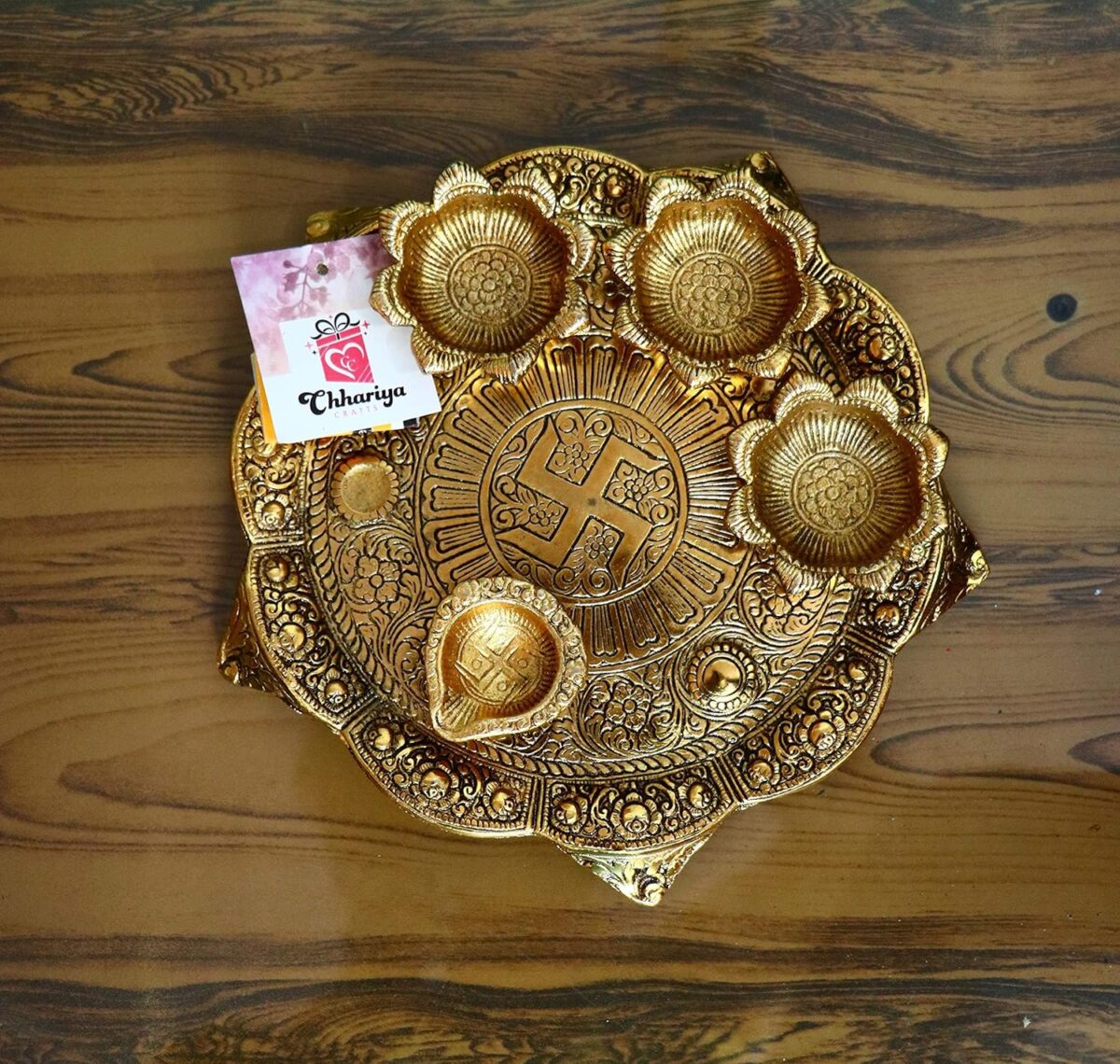 CHHARIYA CRAFTS Metal Pooja Thali with Diya – Golden