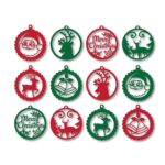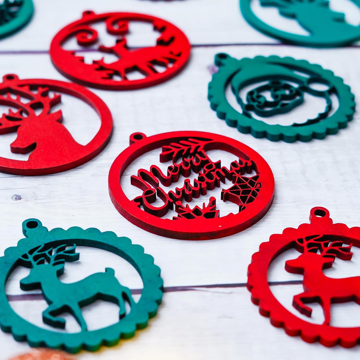 Package Content – One Red & Green Santa Claus, Reindeer, Merry Christmas, Bells, Snowflake, Christmas Tree MDF Wooden Cutout Christmas Tree Decoration Hanging Items (Set of 12)