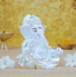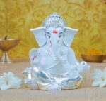 Gold Art India Silver Plated White Gaddi Ganesha 8X6X5 Cm Ganesh Idol for Car Dashboard Small Ganesha Murti Ganpati Idol for Home Decor Puja Lord Ganesh Statue Gift for Office Desk Puja Room Figurine