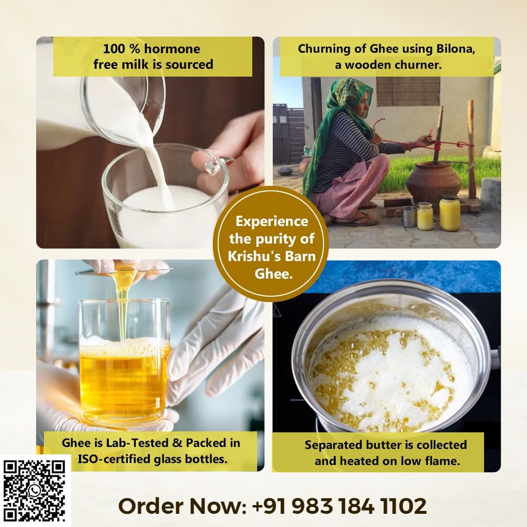 KRISHU’S BARN GHEE: Indulge in the pure goodness of Krishu’s Barn Ghee, a pure ghee made from 100% hormone-free cow milk. Our ghee stands out in the market as a symbol of authenticity, blending the essence of pure craftsmanship with the goodness of pure cow milk