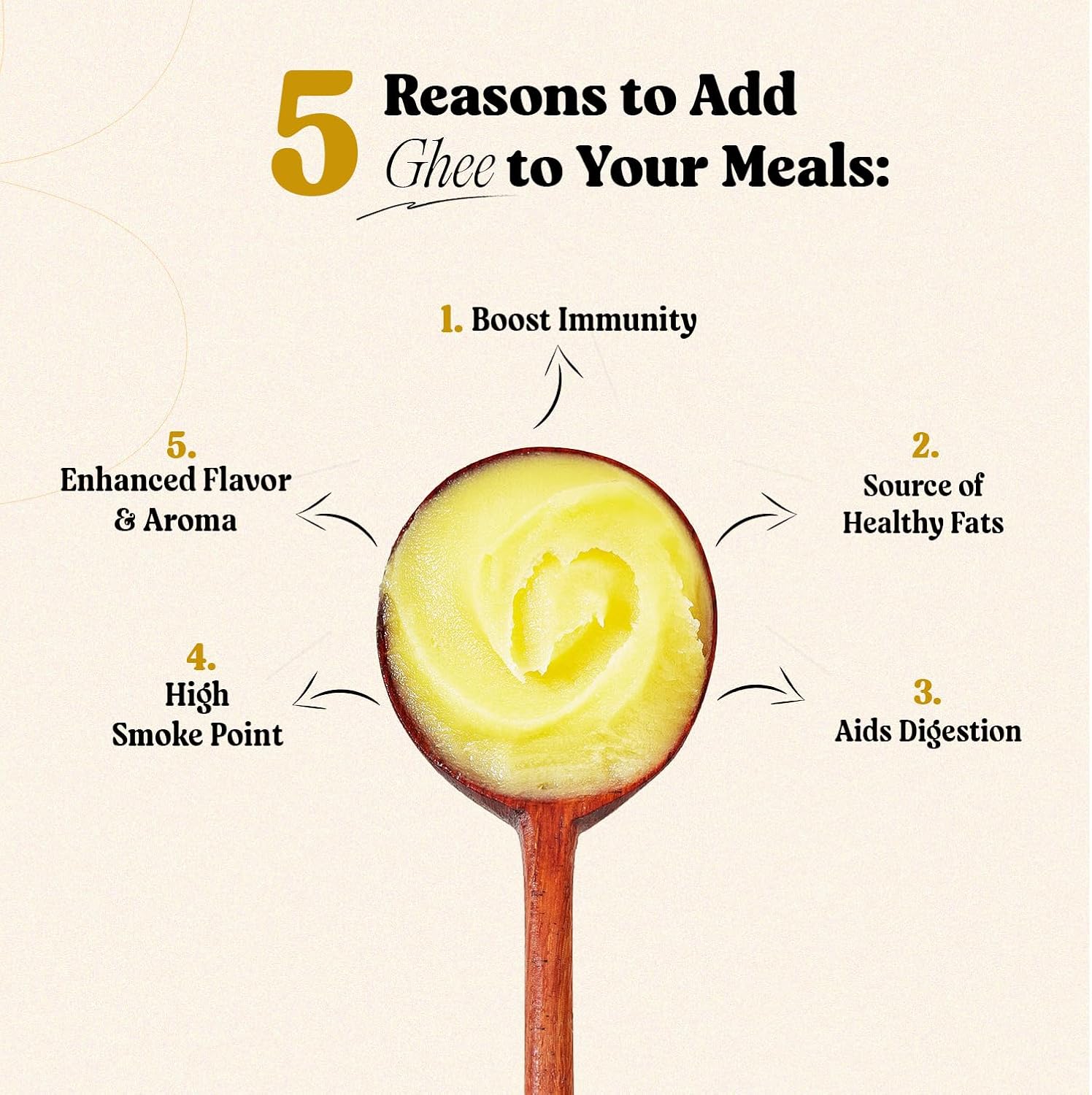 MADE FROM 100% HORMONE-FREE COW MILK : Our desi ghee, crafted using 100% pure, hormone-free milk sourced from healthy vegetarian cows, is the perfect choice for those seeking organic ghee and grass-fed ghee. This ensures the purest quality ghee, free from artificial hormones and rich in the natural goodness of cow’s milk