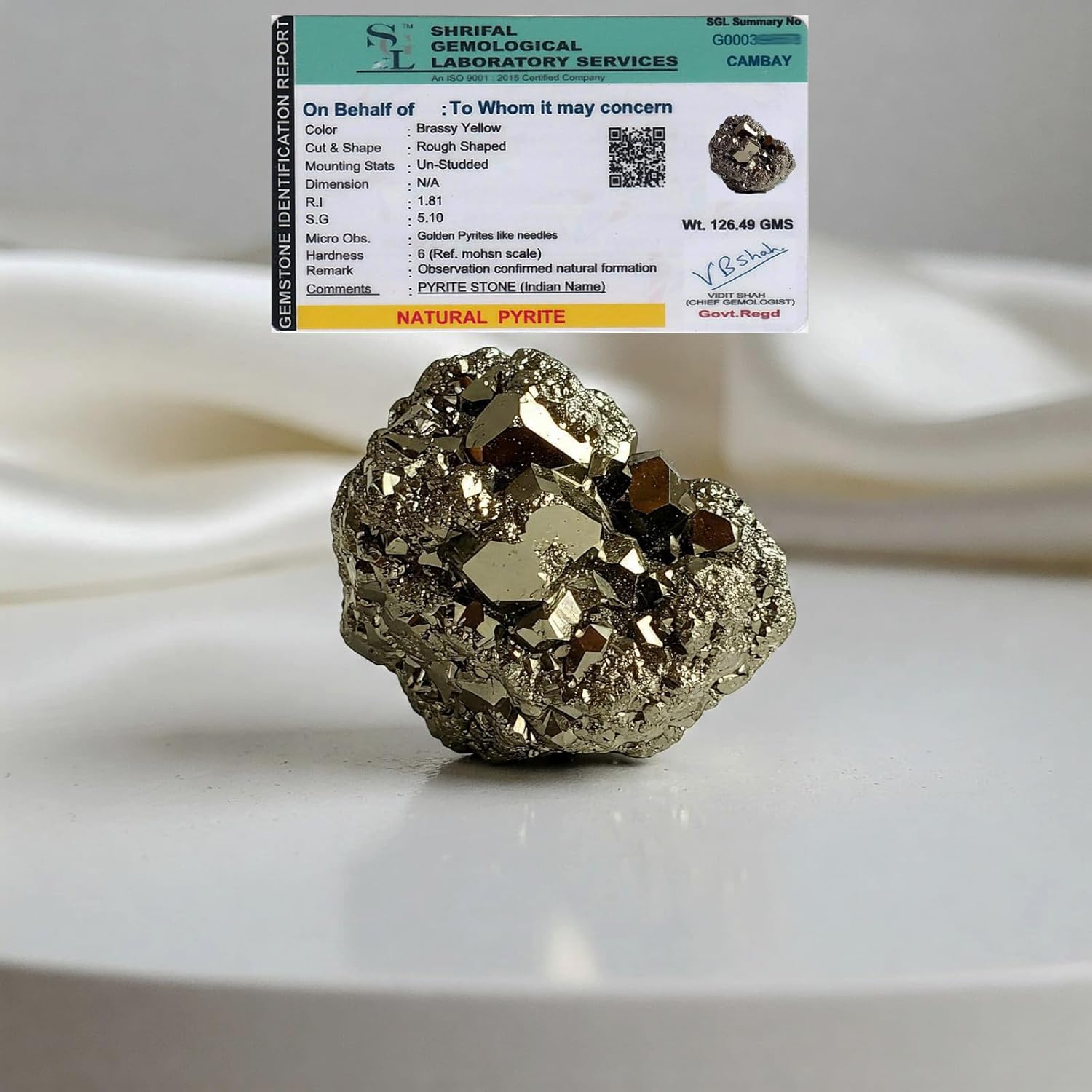 Authentic Peruvian Pyrite Specimen (80 to 120 Grams) each with Individual Lab Test Certificate – Natural Metallic Gold Crystal for Health, Wealth, and Prosperity – High-Quality Cubic & Octahedral Formation, Ideal for Healing, Energy Work, and Decorative Display – Verified Authenticity and Composition Peru pyrite, also known as “fool’s gold,” is a striking mineral known for its metallic luster and golden-yellow hue. Found in the rich mineral deposits of Peru, this mineral forms in cubic crystals and is often associated with sulfur deposits. While not valuable as gold, Peru pyrite is highly regarded by collectors and mineral enthusiasts for its aesthetic appeal and is sometimes used in jewelry or as a decorative stone. In Vastu Shastra, pyrite is believed to attract wealth, prosperity, and positive energy. Placing it in the north or northeast corners enhances financial stability and success. It is also thought to cleanse negative energy, protect the space, and promote harmony. Pyrite placed in workspaces or near entrances is said to boost creativity, productivity, and shield against negative influences, creating a peaceful, prosperous environment. TRUE VALUE FOR MONEY