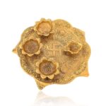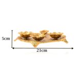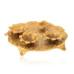 Elevate your spiritual space with this exquisite brass finish pooja thali, featuring an intricate traditional design that beautifully combines form and function. The thali measures 21 cm in length and 5 cm in height, making it a perfect size for both home and office temples. The stunning piece showcases four lotus-shaped diyas arranged symmetrically around a central swastik symbol, all adorned with detailed floral and paisley motifs. The golden brass finish adds a touch of elegance while maintaining the authentic traditional appeal. Each diya cup is crafted in a delicate flower shape with carefully etched details, perfect for holding oil lamps during your daily prayers or special occasions. The thali’s scalloped edges and raised platform design not only enhance its visual appeal but also provide stability. This versatile pooja thali serves as both a functional ritual item and a decorative piece that adds spiritual ambiance to your sacred space. The durable brass construction ensures this thali will remain a cherished part of your worship routine for years to come.