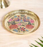 Enhance Your Pooja Rituals: Use this brass plate for bhog and aarti to elevate your daily worship experience with a touch of luxury and tradition. The beautifully carved twin peacock motif on the plate enhances its spiritual significance, making it an elegant brass pooja plate for your home.