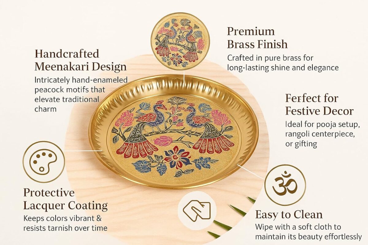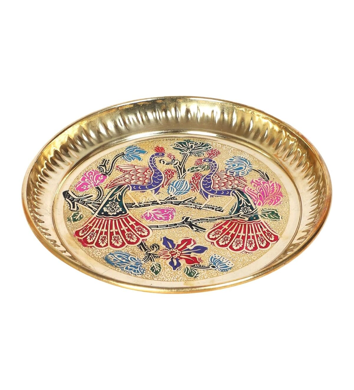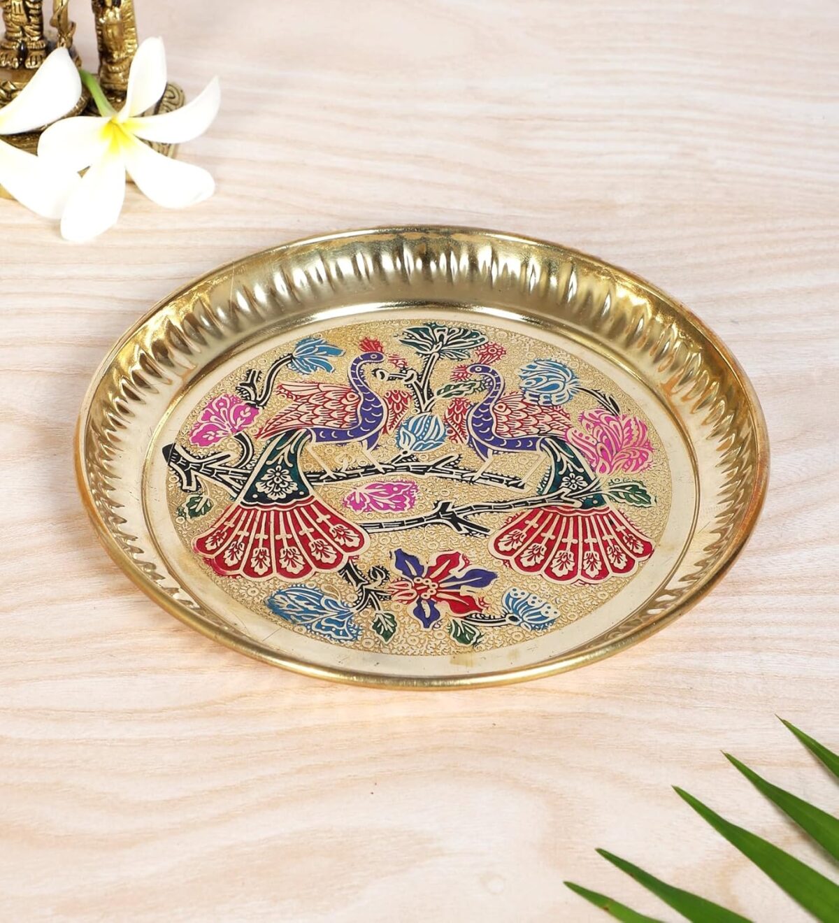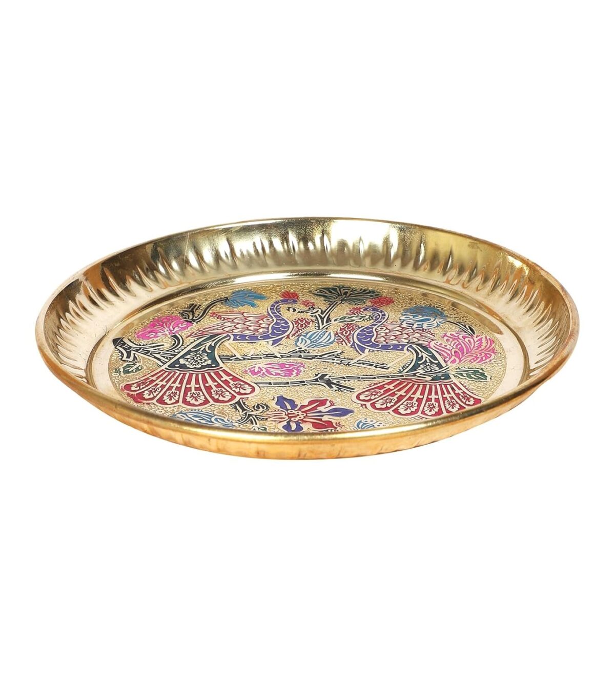 Enhance Your Pooja Rituals: Use this brass plate for bhog and aarti to elevate your daily worship experience with a touch of luxury and tradition. The beautifully carved twin peacock motif on the plate enhances its spiritual significance, making it an elegant brass pooja plate for your home.