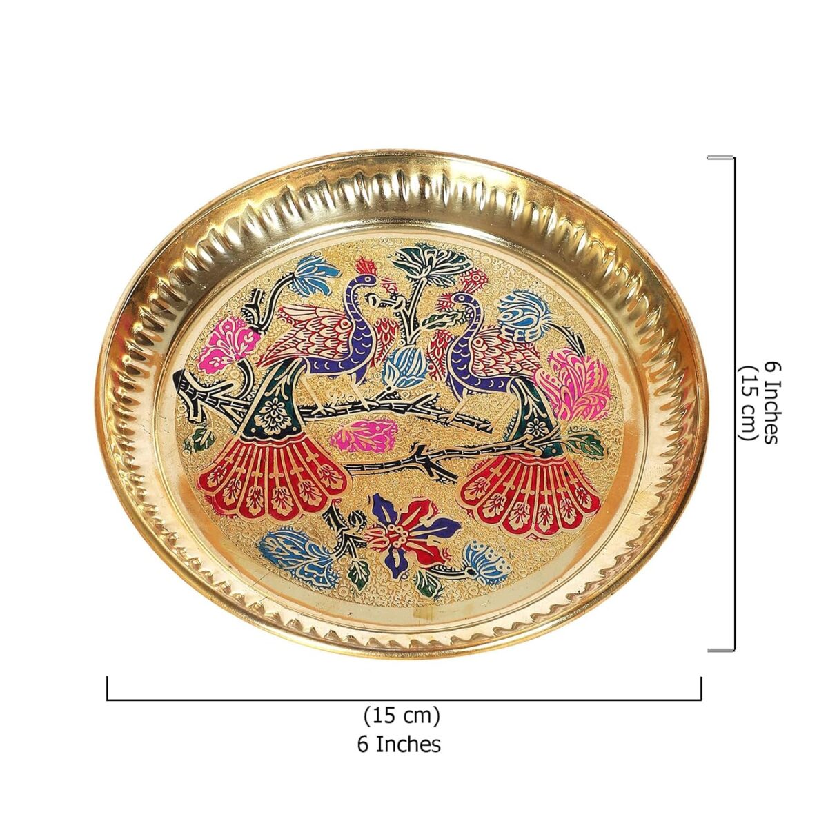 Exquisitely Handcrafted: This 6-inch brass pooja thali features intricate twin peacock carvings, adding a touch of elegance to your puja essentials. This brass pooja thali is ideal for all kinds of religious ceremonies, making it an essential addition to your puja rituals.